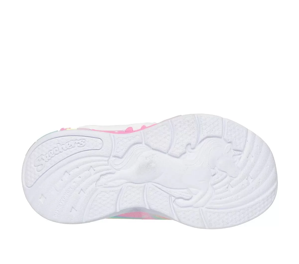 Sparkle and shine in style wearing Skechers S-Lights® Unicorn Chaser. This sporty Magical Collection® lighted design features a synthetic glitter finish upper with unicorn and rainbow side graphic, stretch laces, adjustable instep strap, and a cushioned comfort footbed. Bonus gift with purchase.