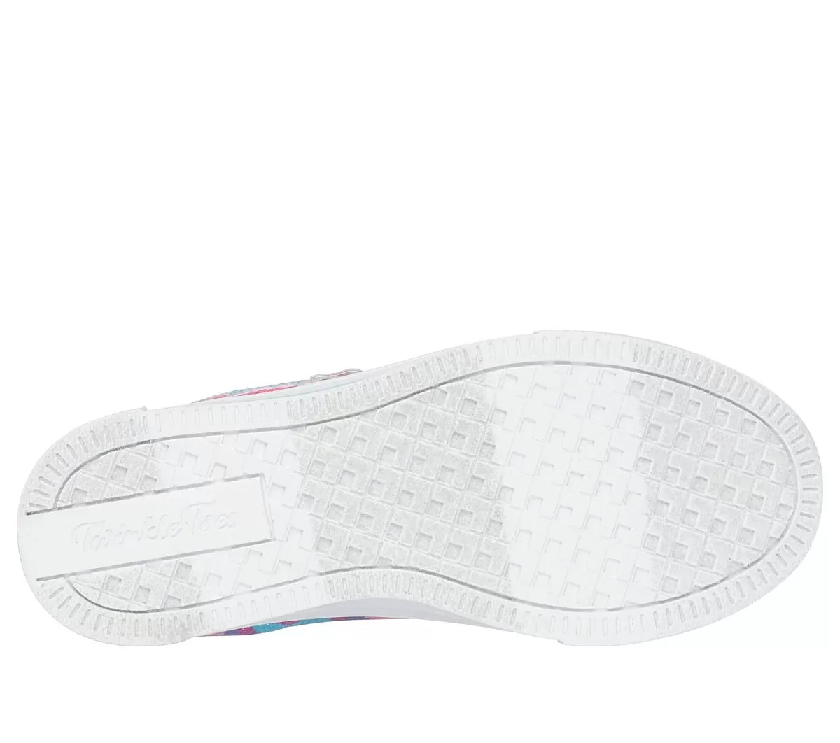 Light up your steps with star-studded style in Skechers Twinkle Toes®: Twinkle Sparks – Cosmic Burst. This lighted sneaker features a synthetic glitter upper with a lace-up front, star design detail, zip-up closure, and an embellished light-up toe cap.