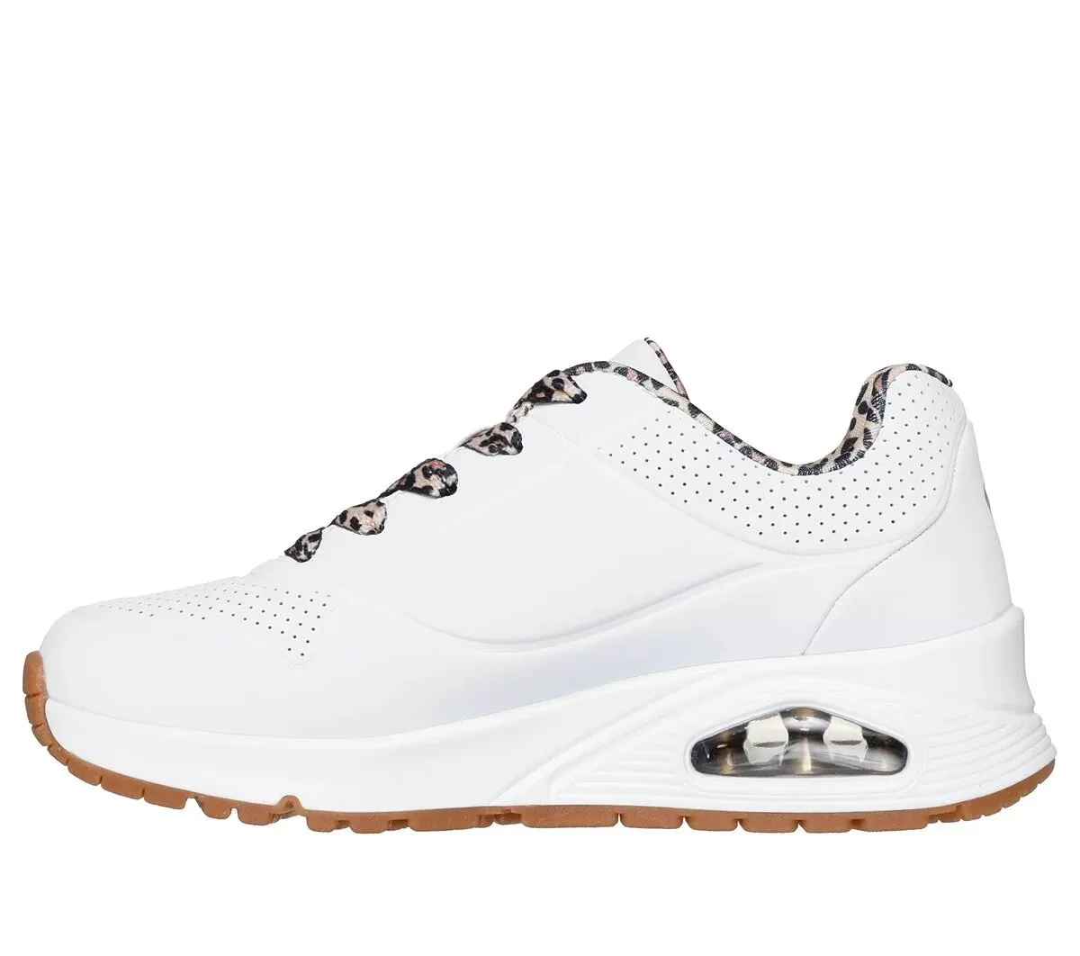 Follow your style instincts wearing Skechers Street™ Uno Gen1 – Leopard Chic. This lace-up fashion sneaker features a synthetic perforated durabuck upper with leopard print trim, a second set of laces, Skech-Air® visible airbag at the midsole, and a cushioned Skechers Air-Cooled Memory Foam® insole.