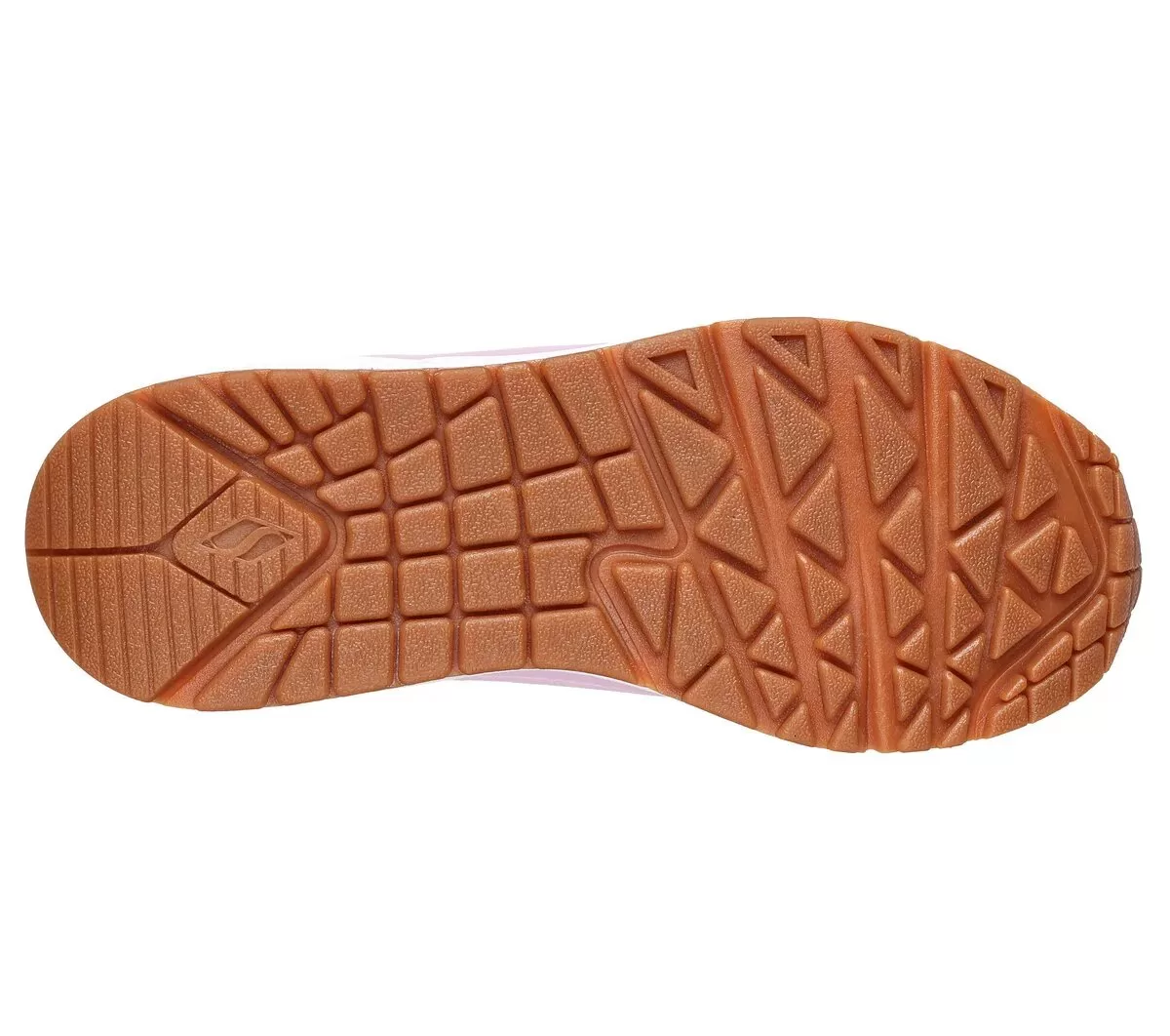 Level up your sneaker game with cushioned comfort wearing Skechers Street™ Uno Gen1 – Shimmer Away. This lace-up fashion sneaker features a synthetic duraleather upper with metallic trim, Skechers Air-Cooled Memory Foam® comfort insole, and a visible Skech-Air® airbag midsole.