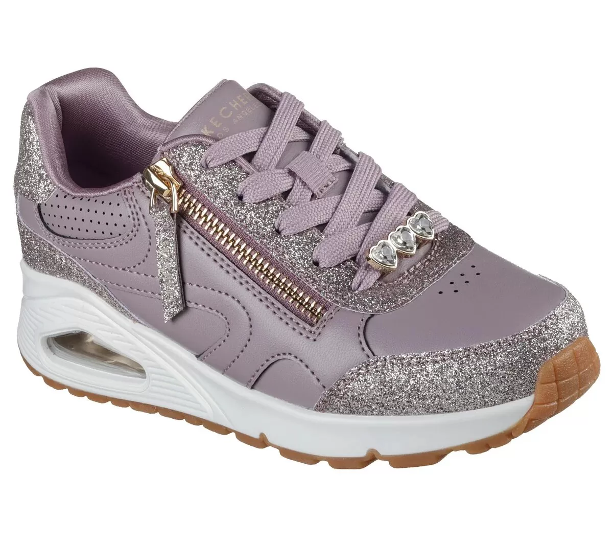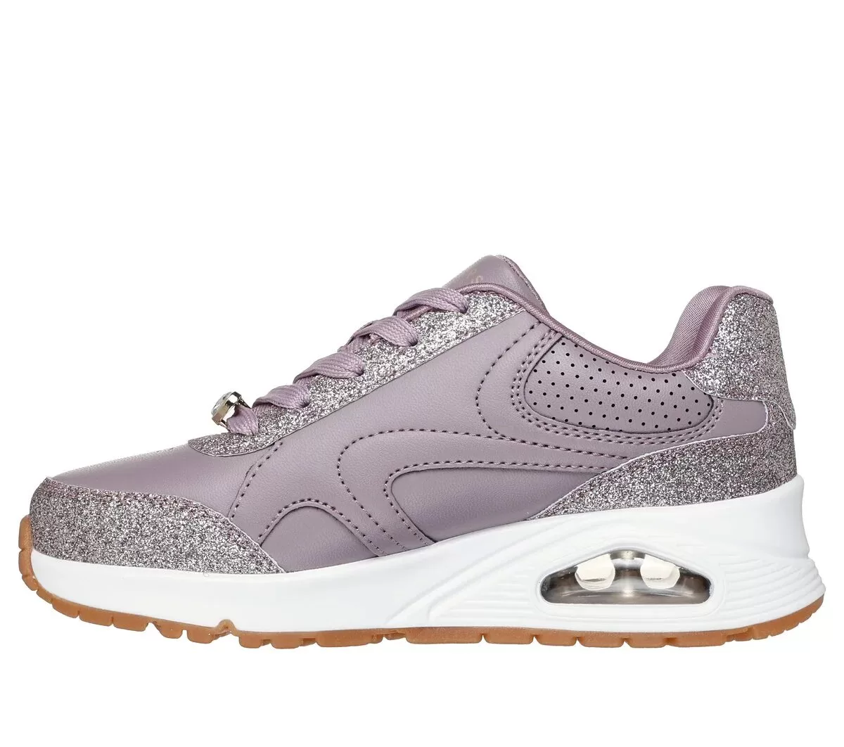 Sparkle with every cushioned step wearing Skechers Street™ Uno Gen1 – Gem Style. This lace-up Skechers adaptive closure design features a synthetic upper with glittery overlays, a quarter zip closure, a Skechers Air-Cooled Memory Foam® comfort insole, and a visible Skech-Air® airbag midsole.