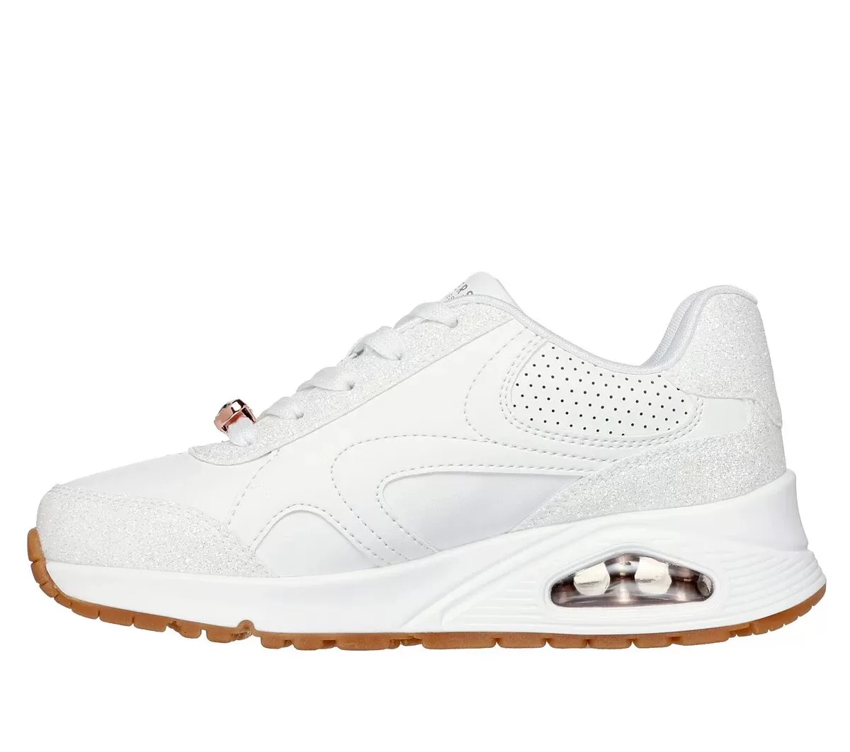 Sparkle with every cushioned step wearing Skechers Street™ Uno Gen1 – Gem Style. This lace-up Skechers adaptive closure design features a synthetic upper with glittery overlays, a quarter zip closure, a Skechers Air-Cooled Memory Foam® comfort insole, and a visible Skech-Air® airbag midsole.