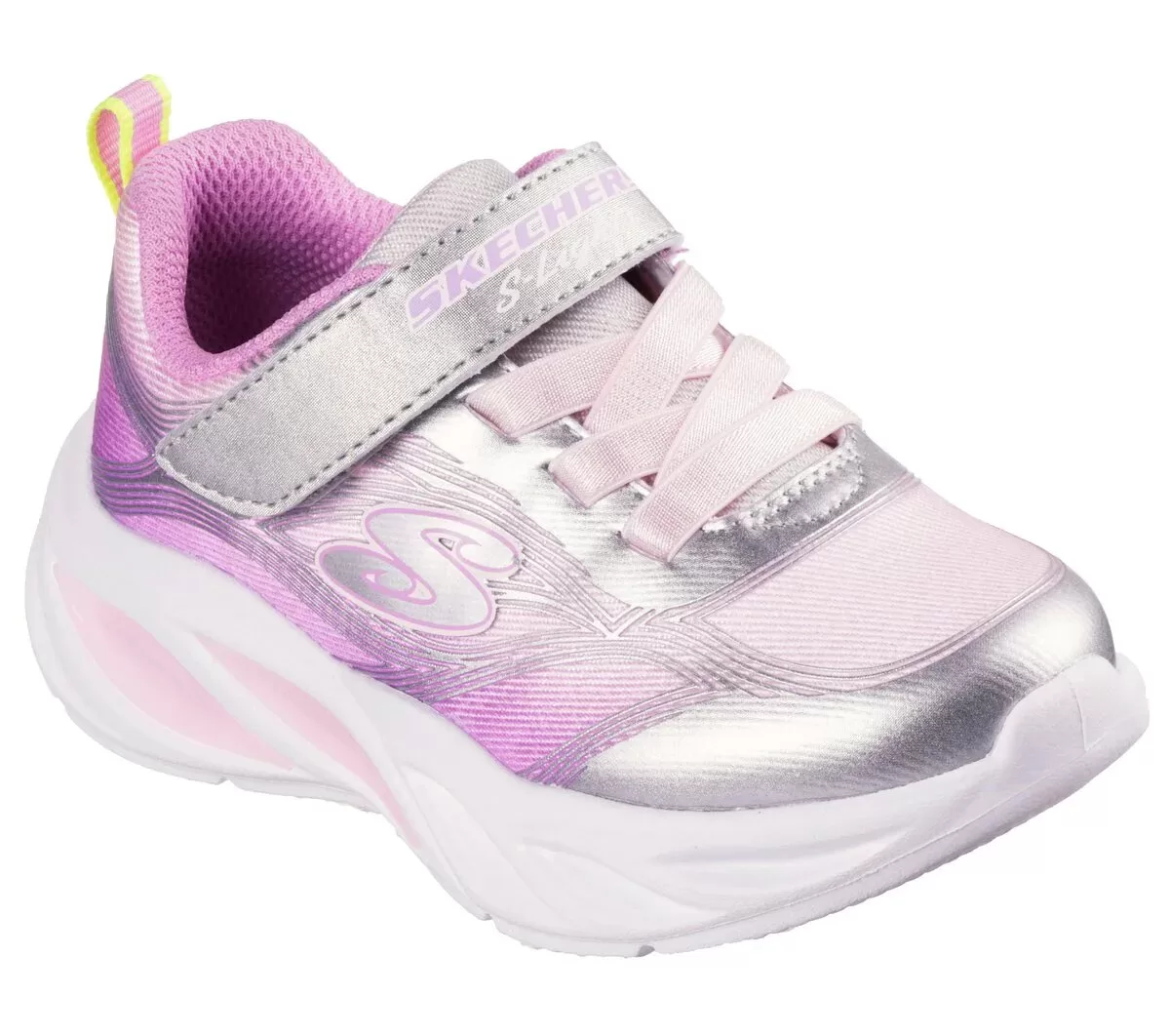 Light up the playground wearing Skechers S-Lights®: Cosmic Glow. This light-up active design features an ombre sparkle mesh and synthetic upper with stretch laces, an adjustable instep strap, and a well-cushioned midsole with step-activated lights.