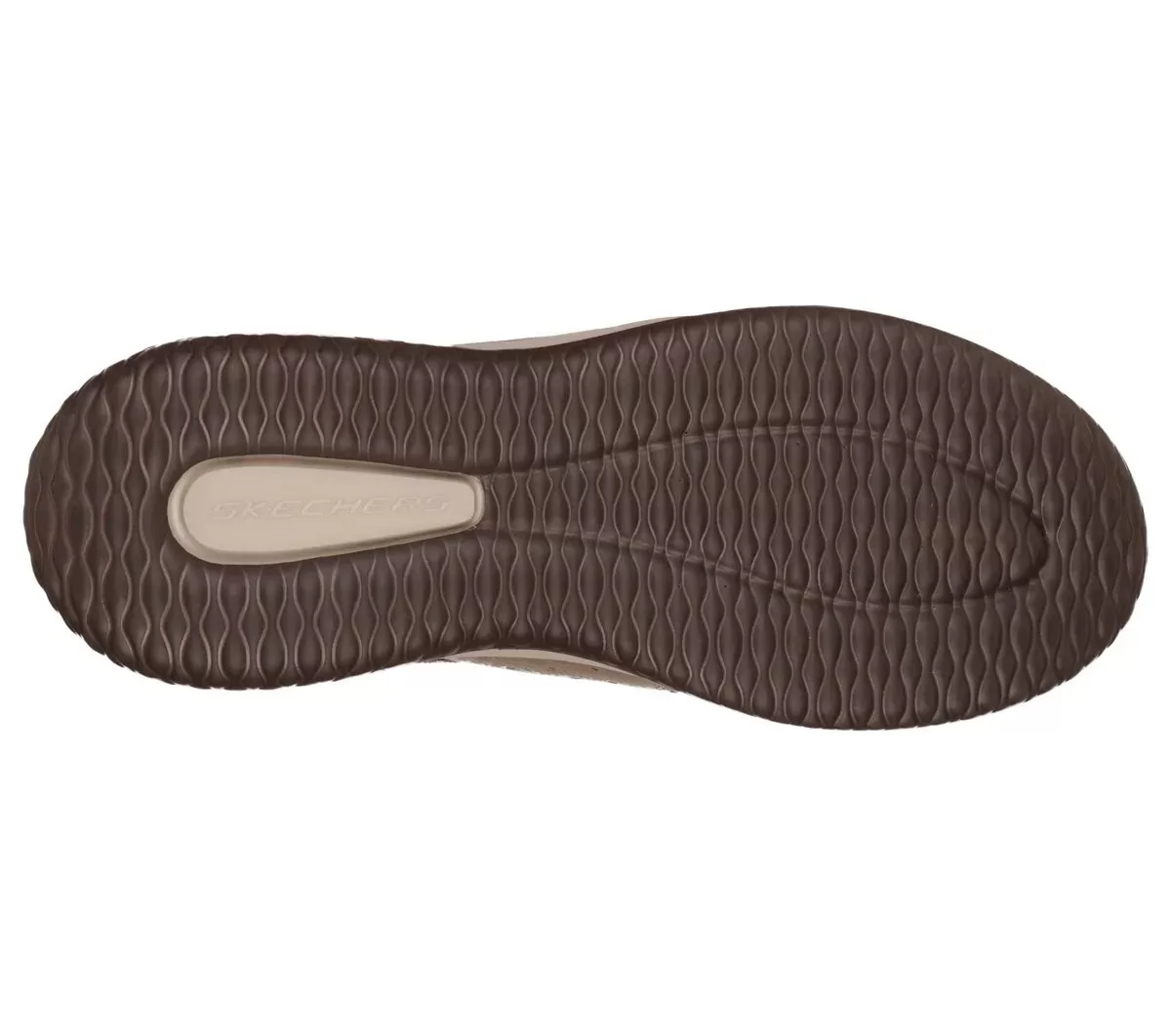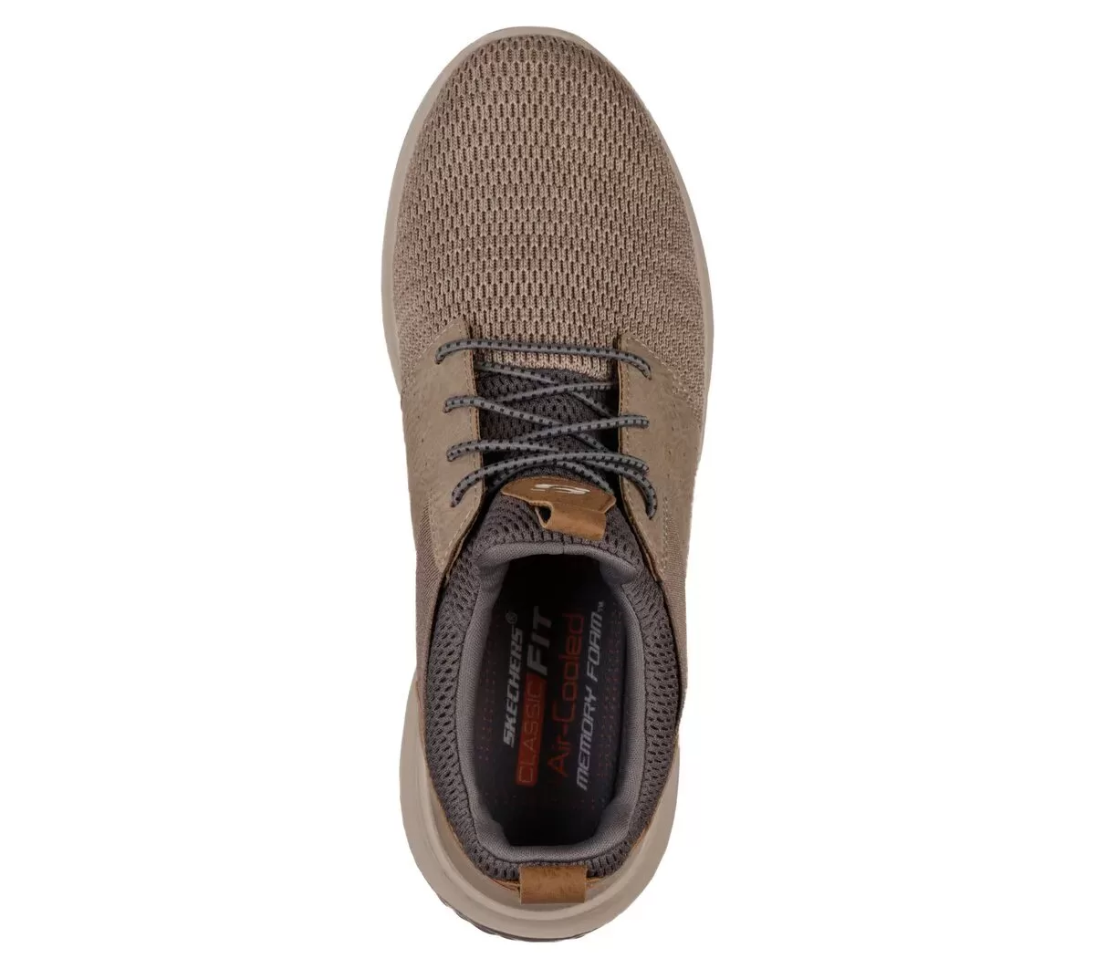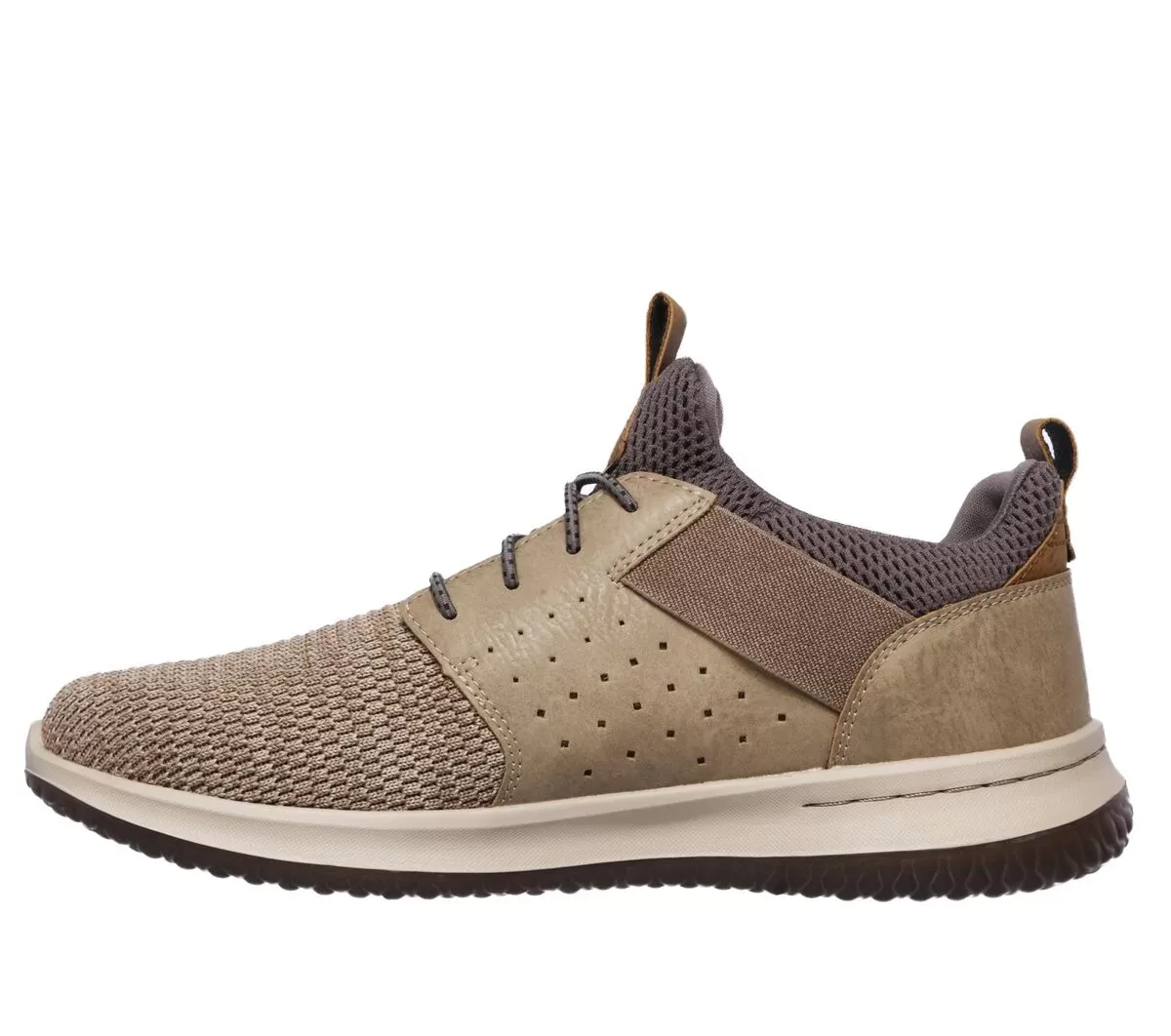 Sport style and lightweight comfort deliver in Skechers Delson – Camben. Lightweight Skech Knit mesh fabric and synthetic upper in a slip-on laced casual with Air-Cooled Memory Foam insole and flexible midsole.