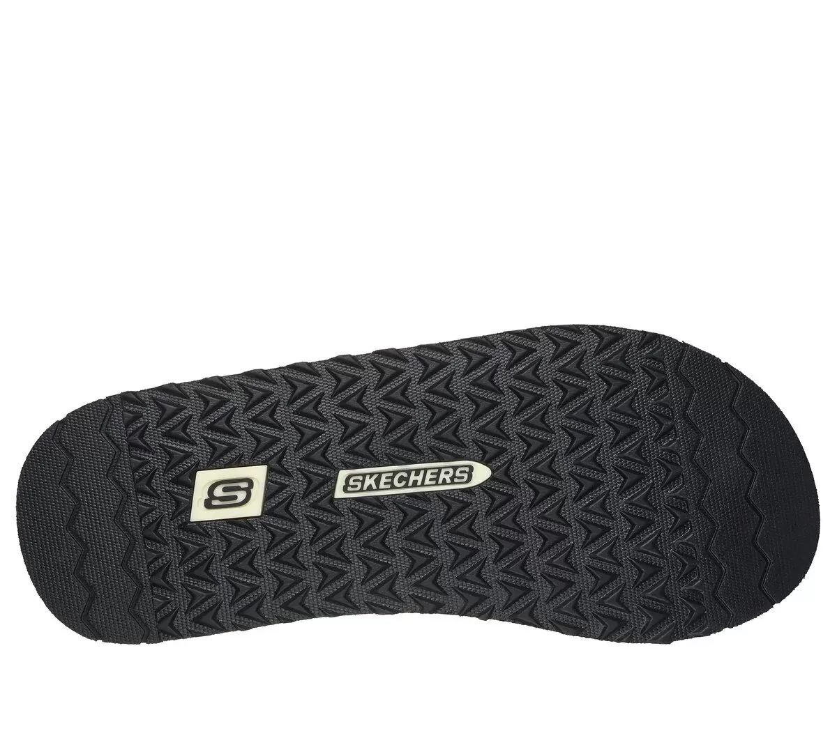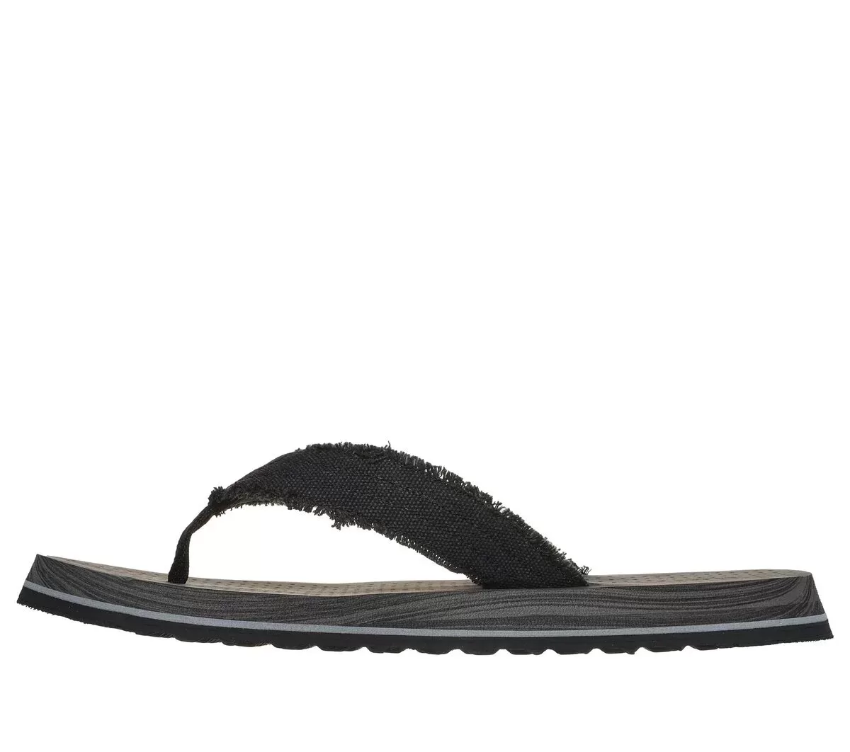 Bring on the sand, surf, and sun in Skechers Tantric – Fritz. This casual 3-point thong sandal features a frayed canvas upper with a faux woodgrain and sports stripe detailed midsole.