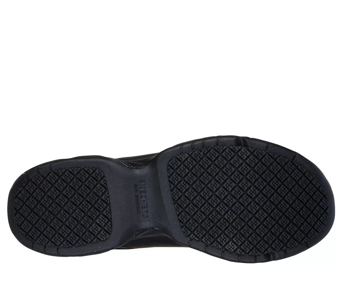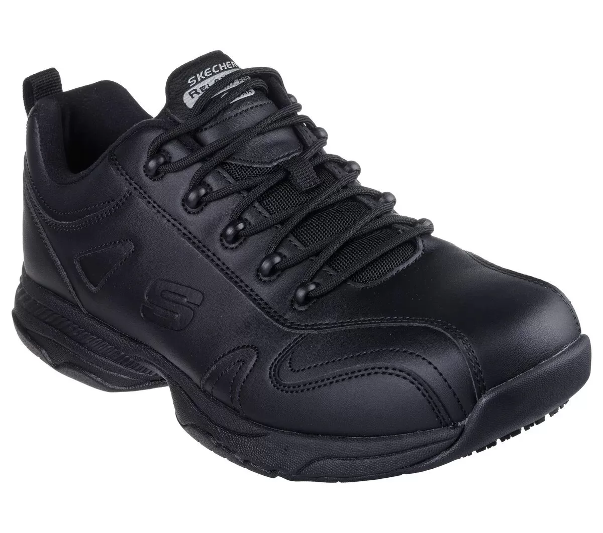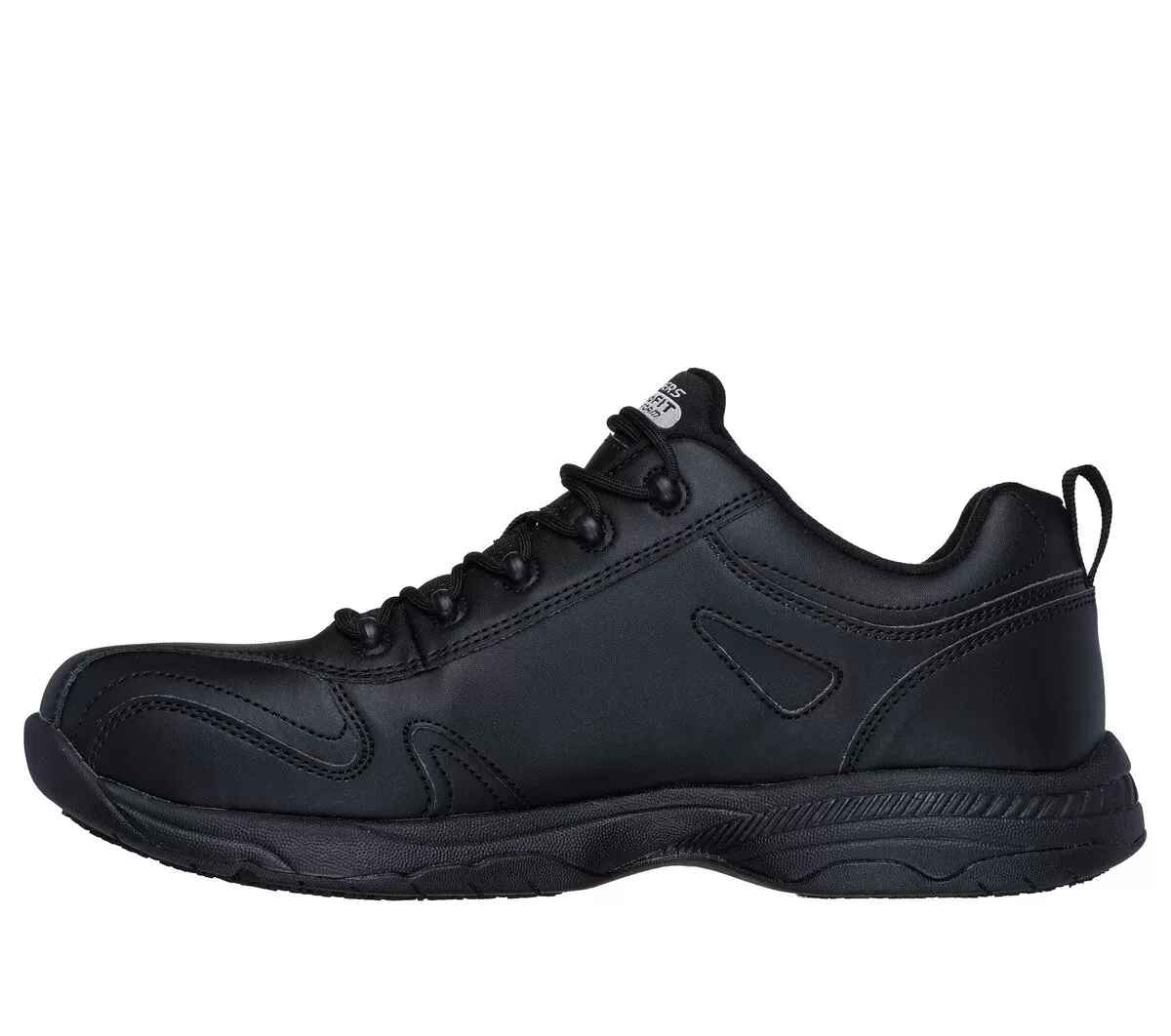 Sporty style, all day safety, and comfort combine wearing Skechers Work™ Relaxed Fit®: Dighton – Strits. This roomy lace-up features a smooth synthetic upper with a Skechers Memory Foam™ insole and slip-resistant outsole.