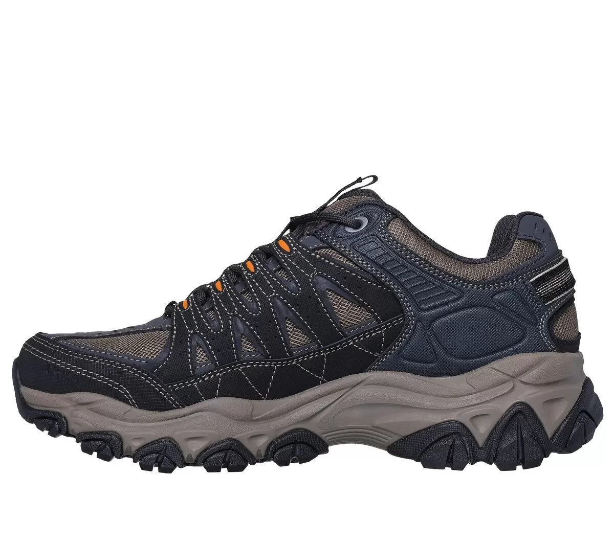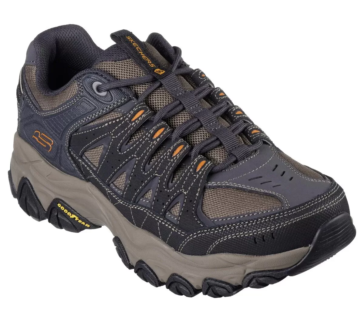 Explore wild terrain in comfort with Skechers After Burn M.Fit 2.0. This lace-up outdoor trail design features a leather, synthetic and mesh upper with a cushioned Skechers Memory Foam™ insole and Goodyear® Rubber Outsole.