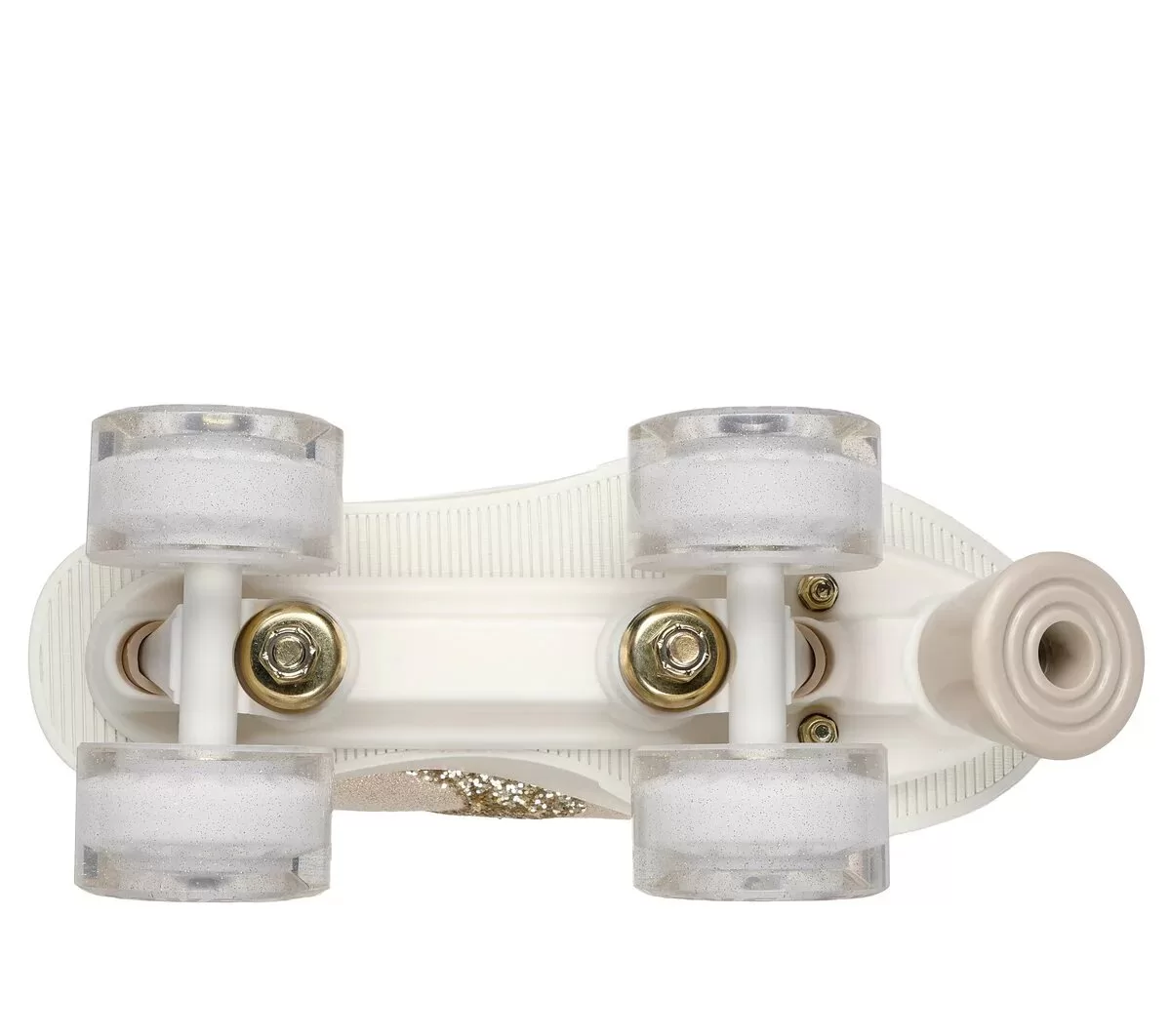 Roll into your next adventure with retro vibes and a touch of glam in Skechers 4 Wheeler 24K Gold. This roller skate sneaker features a lace-up suede and duraleather upper with a glitter trim, Skechers Air-Cooled Memory Foam® insole, and solid urethane wheels with front brakes.