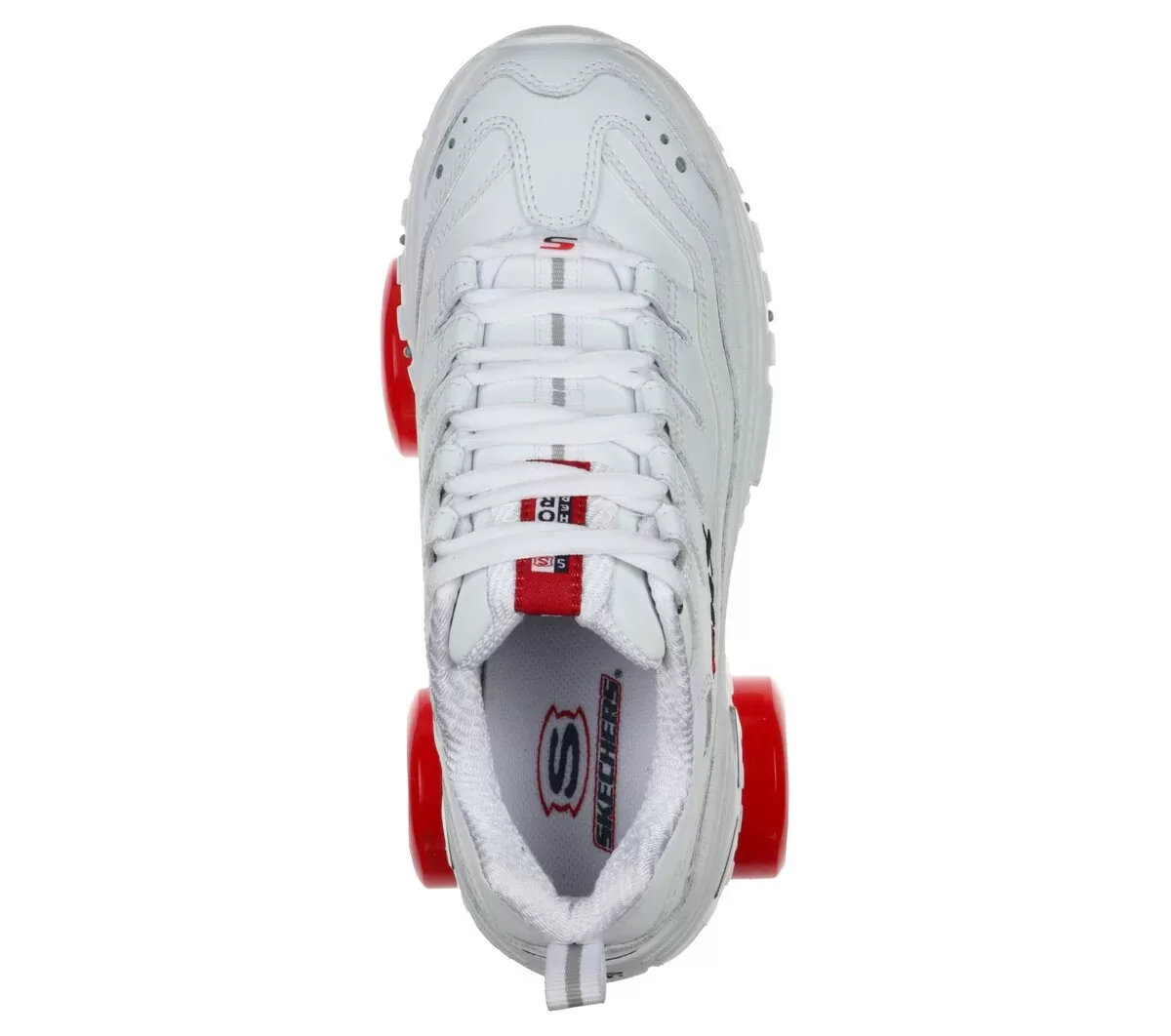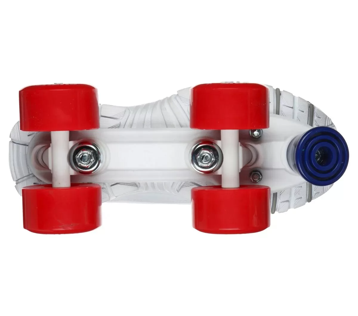 Roll into fun with the stylish Skechers 4 Wheeler. This sporty roller skate sneaker features a smooth leather upper with a lace-up front and solid urethane wheels with front brakes.