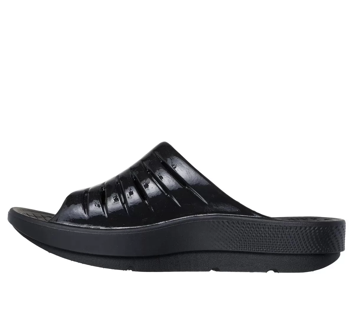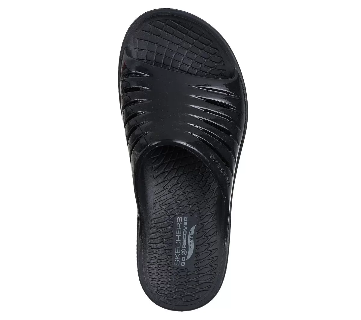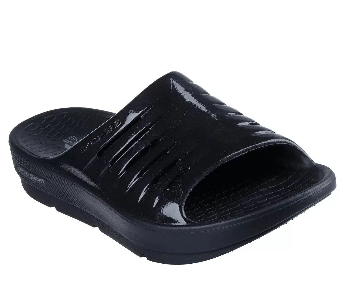 Relax in specialized comfort and style wearing Skechers GO RECOVER® Refresh – Glossy. This athletic recovery slide sandal has been granted the APMA Seal of Acceptance and features a high gloss synthetic upper with linear perforations, a ultra-soft Lux Foam+ footbed, and premium HYPER BURST® foam with Arch Fit® support that redistributes pressure for impact reduction.