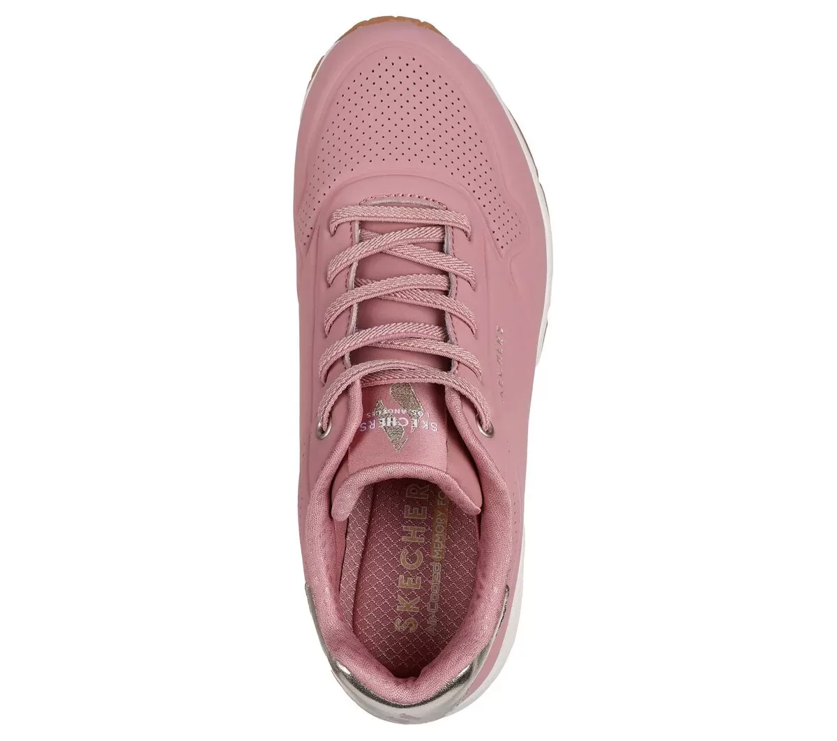 Enjoy a classic style this season wearing Skechers Street™ Uno – Shimmer Away. This wedge fit fashion sneaker features a synthetic durabuck upper with metallic heel trim, stretch laces, a Skechers Air-Cooled Memory Foam® insole, and a Skech-Air® visible airbag midsole.