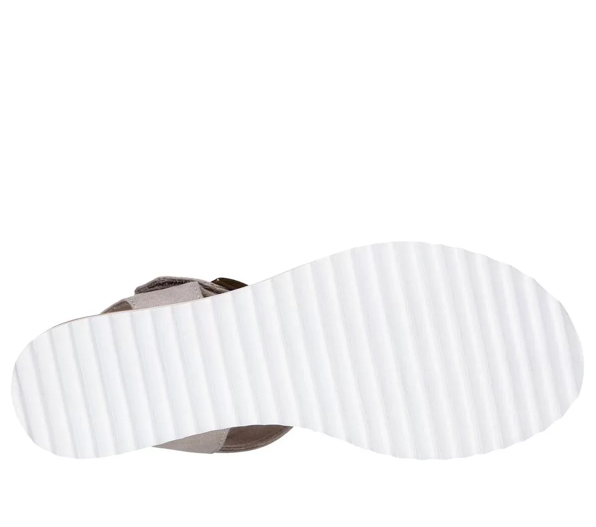Get warm weather ready wearing BOBS® from Skechers® Desert Kiss – Serendipitous. This vegan fashion wedge sandal features a faux suede upper with perforation details, a metallic-buckled instep strap, perforated midsole trim, plus a cushioned Skechers Memory Foam™ footbed. BOBS® from Skechers® is committed to saving the lives of pets in need.