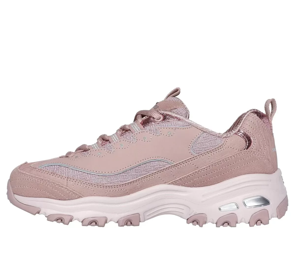 A classic look gets updated with comfort in Skechers D’Lites® – Reflections. This lace-up fashion style features a leather upper with metallic trim and a cushioned Skechers Air-Cooled Memory Foam® insole.