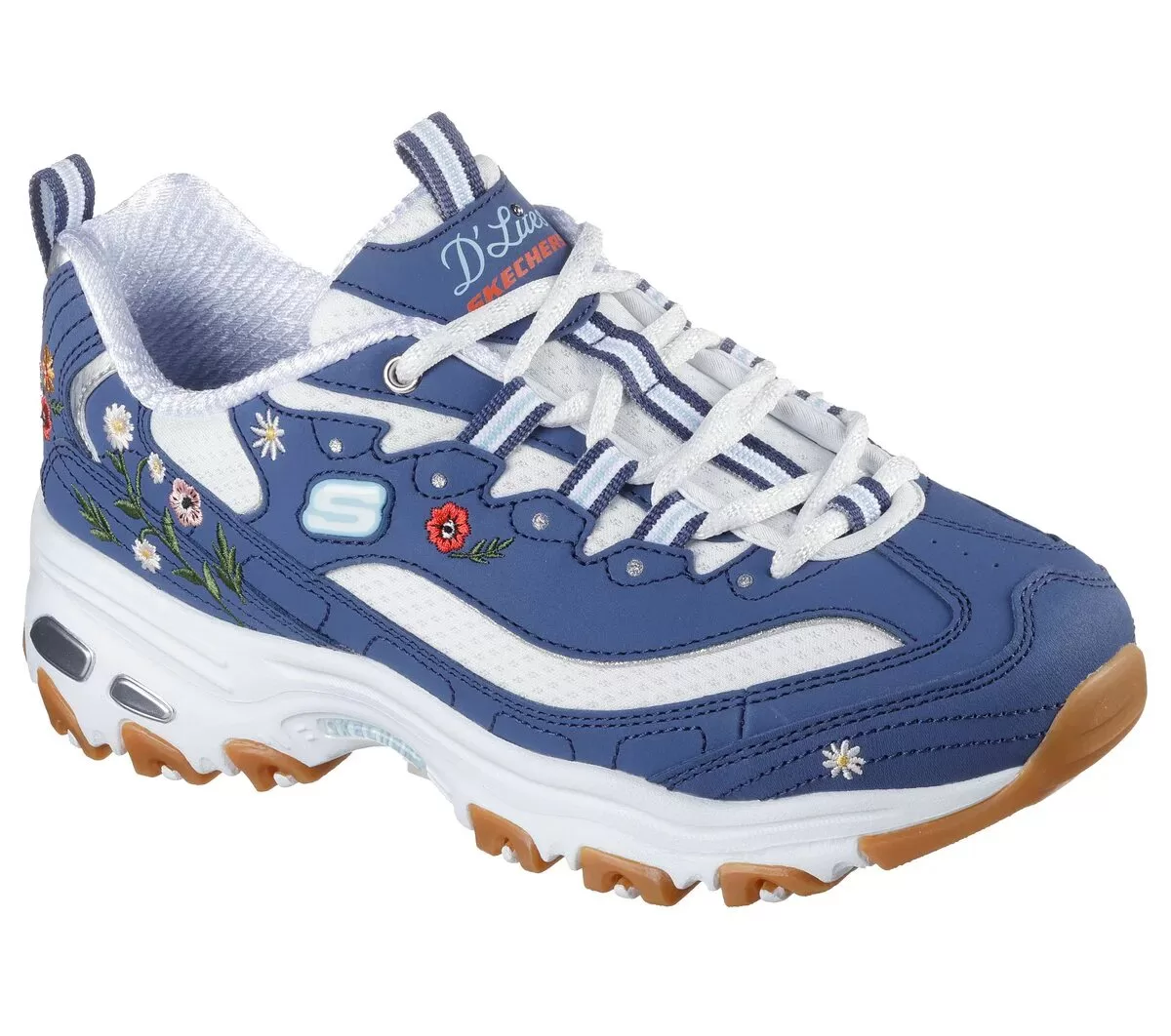 Step out in iconic style with a floral twist wearing Skechers D’Lites® – Spring Bloom. This casual lace-up design features a duraleather upper with embroidered flowers, a cushioned Skechers Air-Cooled Memory Foam® insole, and a supportive shock-absorbing midsole.