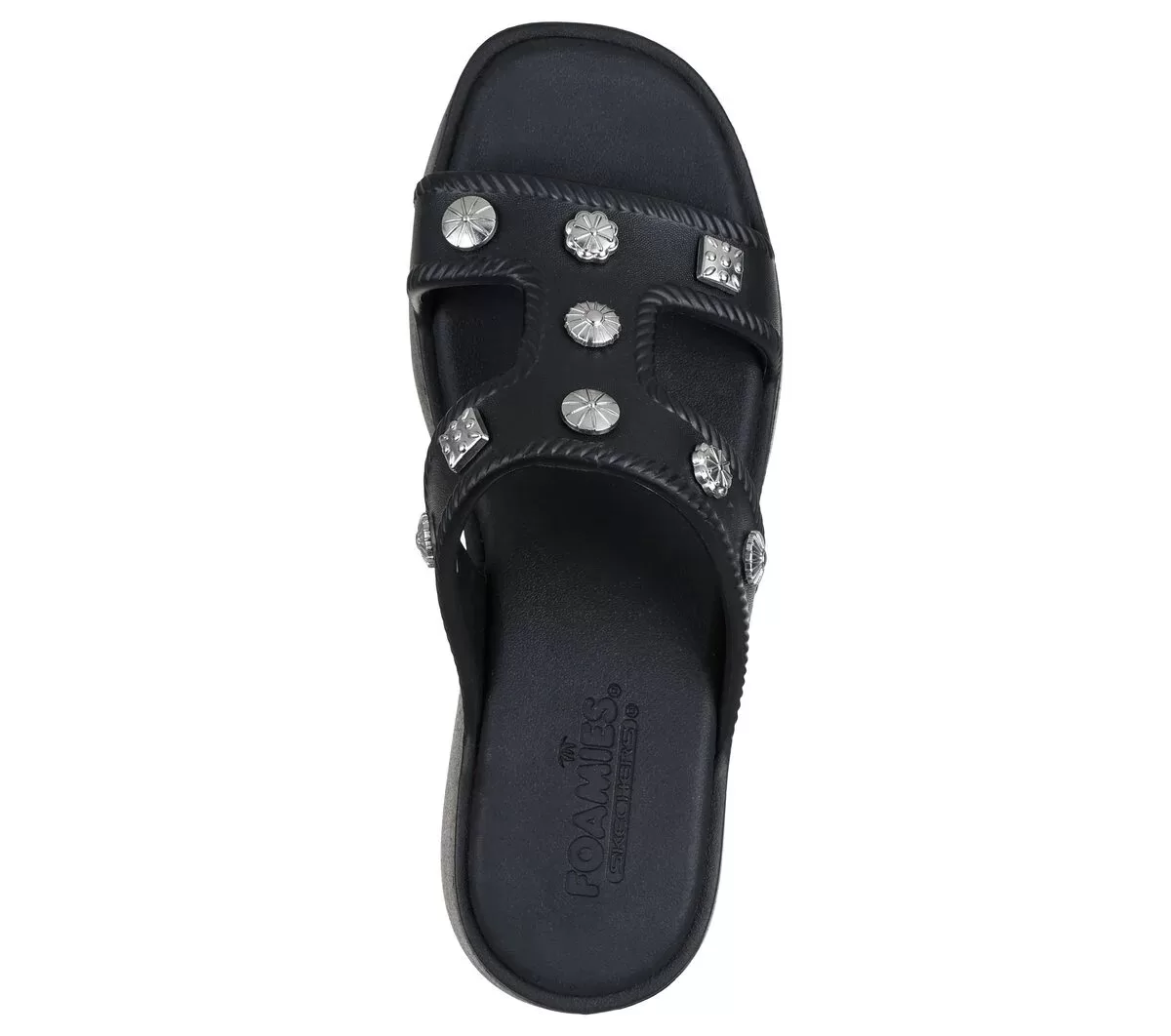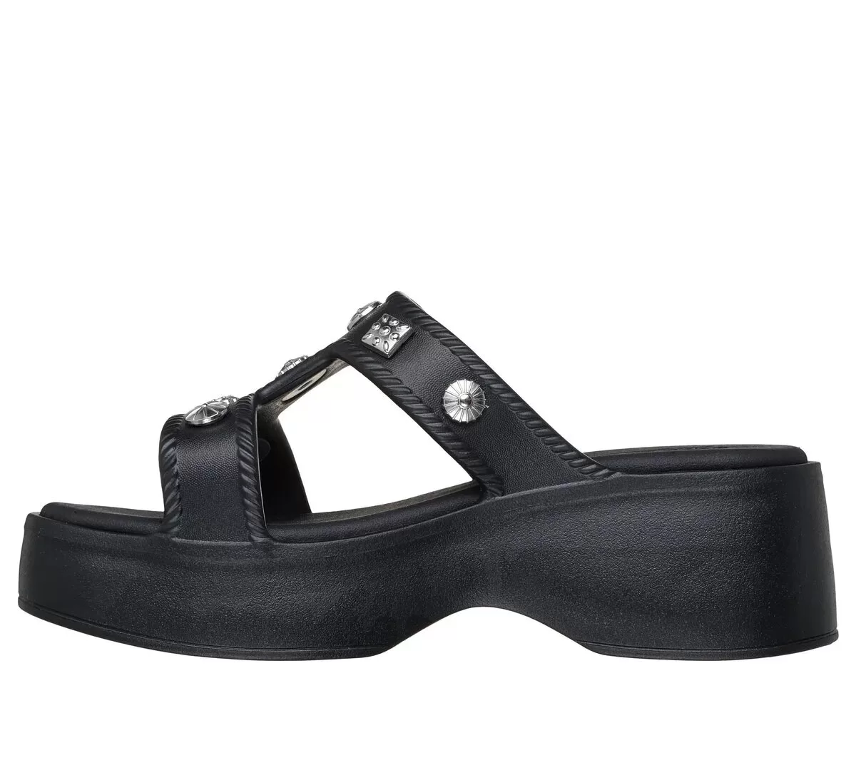 Get a fashion-worthy boost wearing Skechers Foamies®: Rave – It-Girl. This sculpted T-strap fashion slide sandal features a flexible Foamies® EVA upper with a cushioned footbed, deco metallic bits, and a platform midsole.