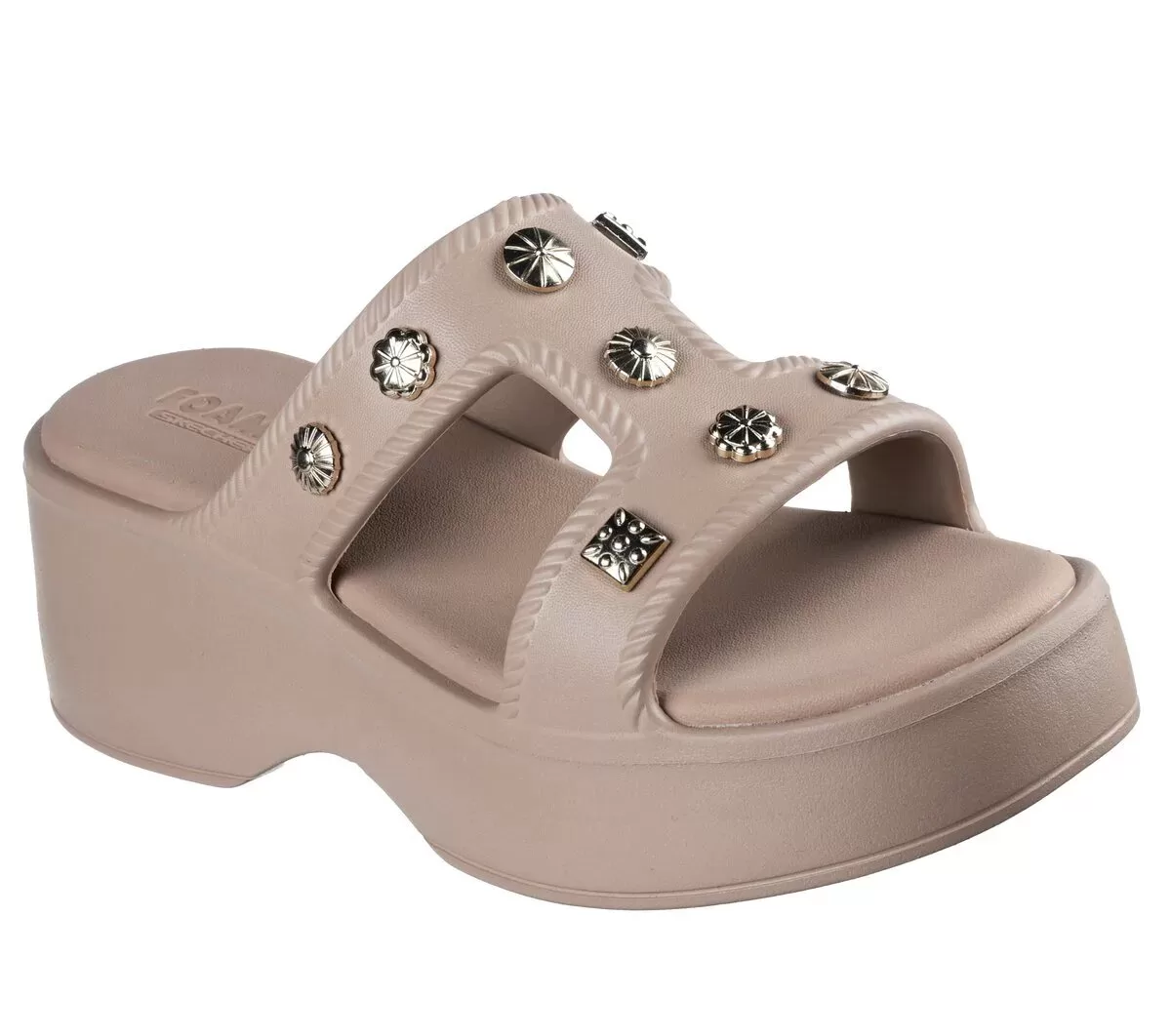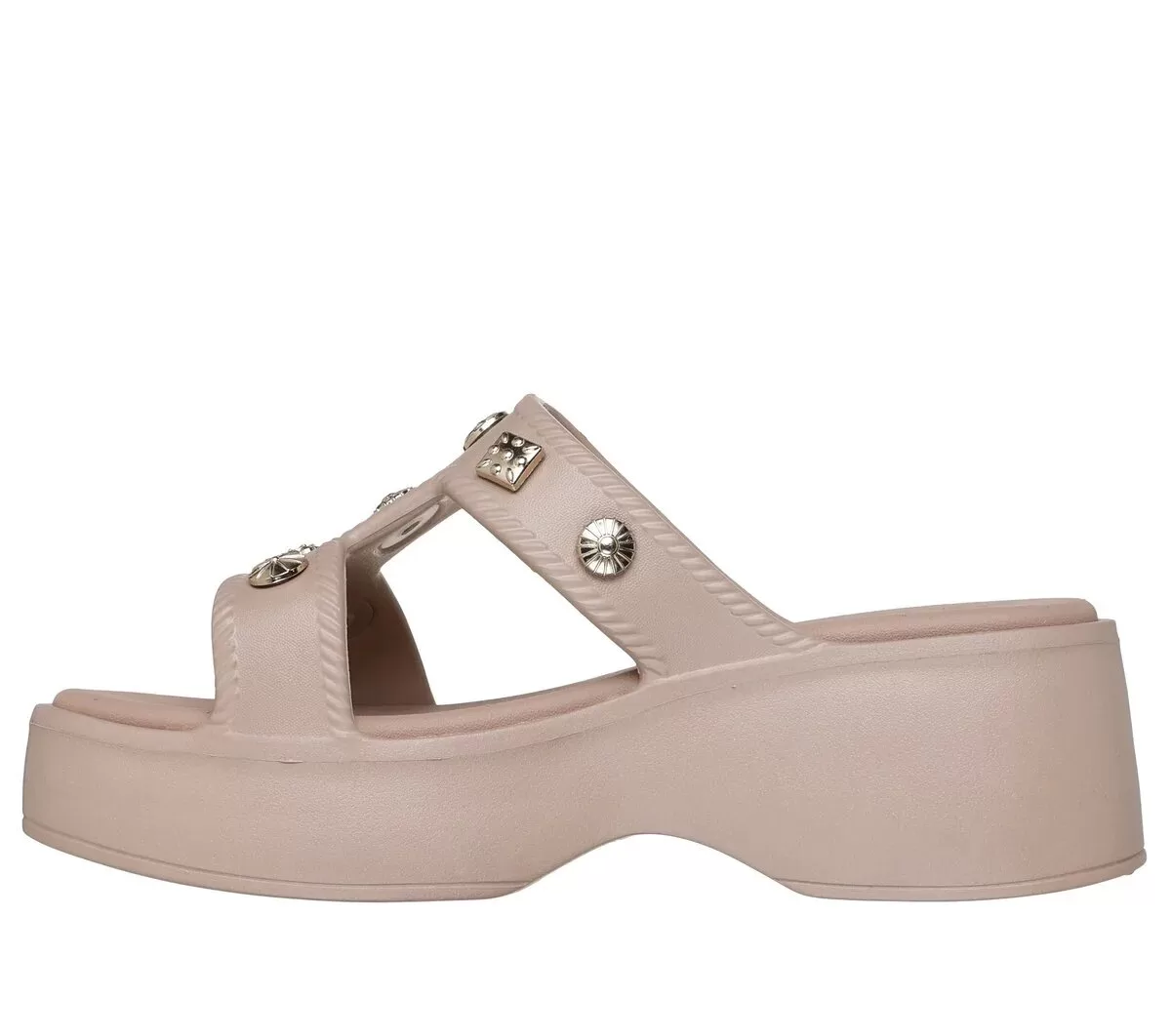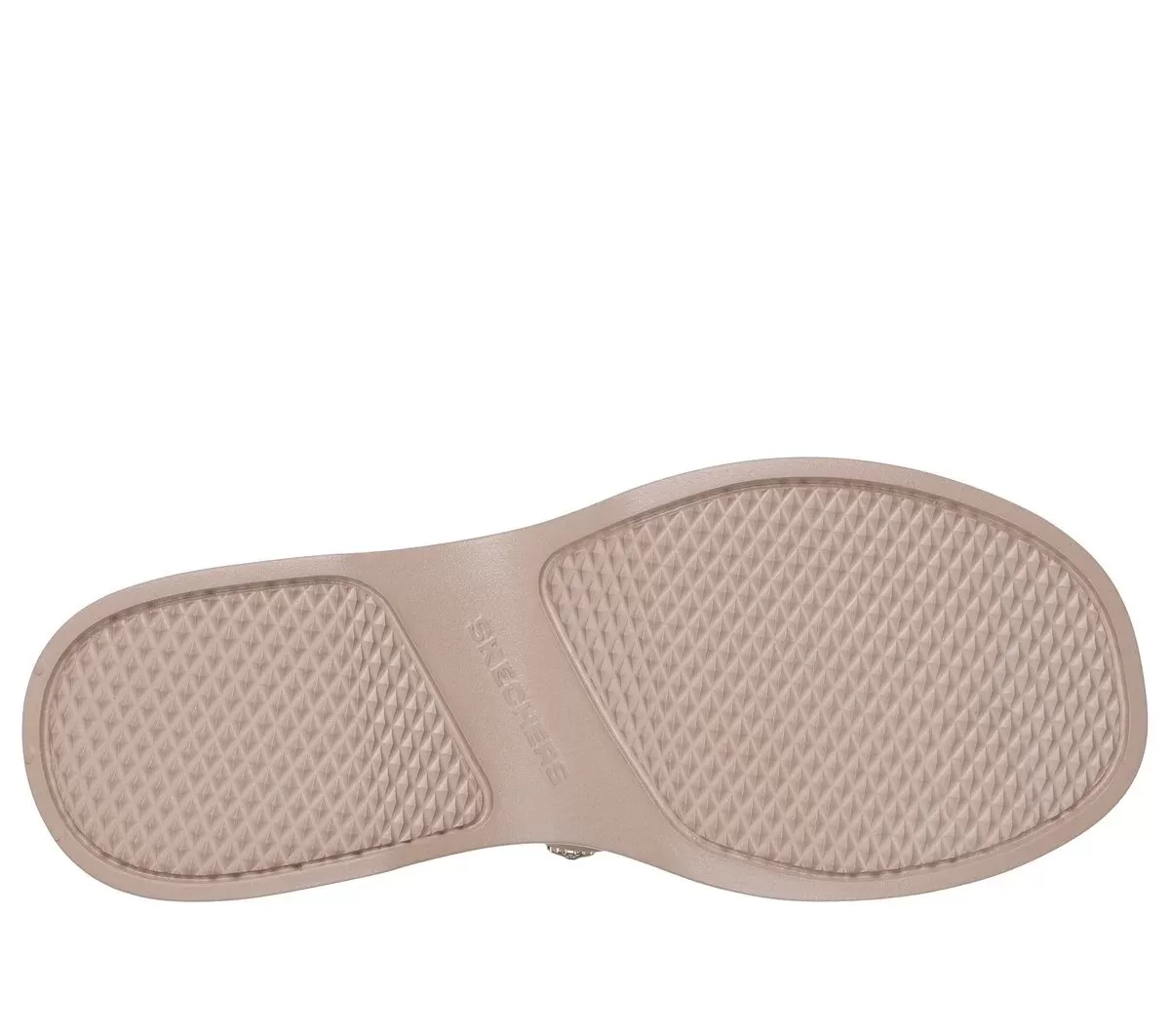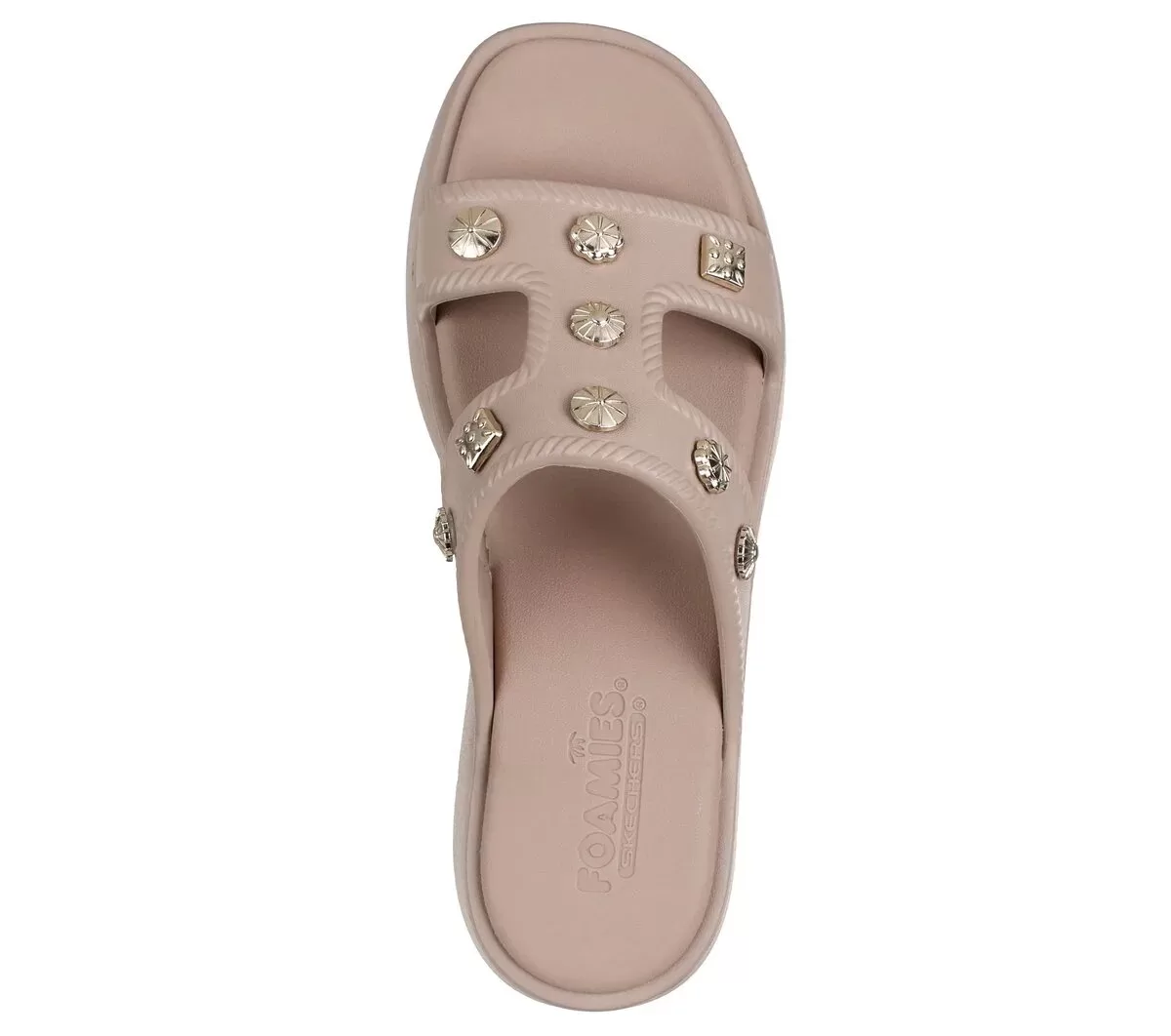 Get a fashion-worthy boost wearing Skechers Foamies®: Rave – It-Girl. This sculpted T-strap fashion slide sandal features a flexible Foamies® EVA upper with a cushioned footbed, deco metallic bits, and a platform midsole.