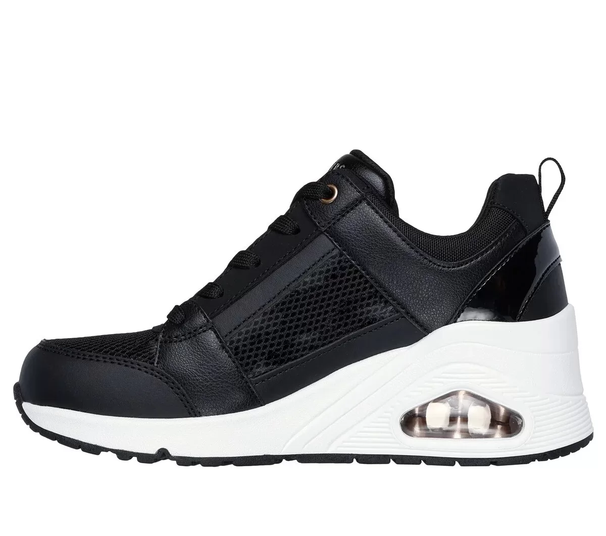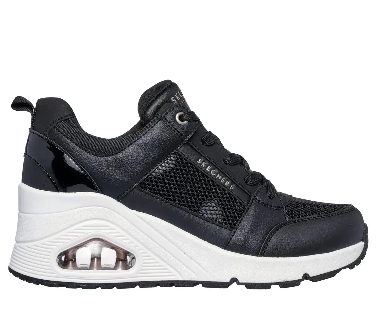 Elevate your look with stylish comfort wearing Skechers Street™ Uno Wedge – Everything Nice. This fashion style features a duraleather, mesh and leather upper with patent trim, Skechers Air-Cooled Memory Foam® insole, and a platform wedge with a visible Skech-Air® air-cushioned midsole.