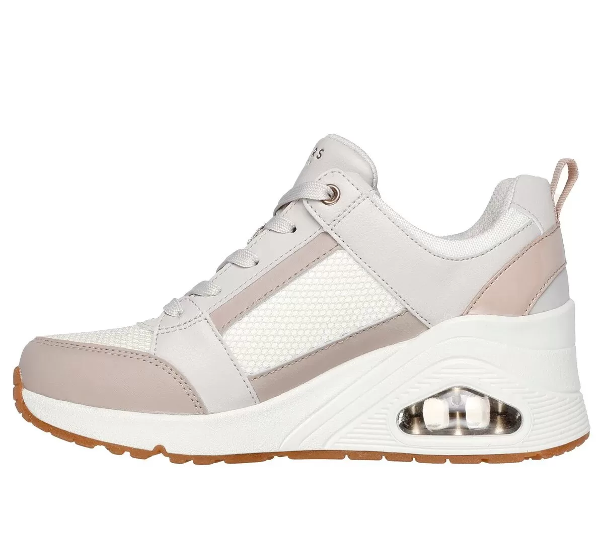 Elevate your look with stylish comfort wearing Skechers Street™ Uno Wedge – Everything Nice. This fashion style features a duraleather, mesh and leather upper with patent trim, Skechers Air-Cooled Memory Foam® insole, and a platform wedge with a visible Skech-Air® air-cushioned midsole.