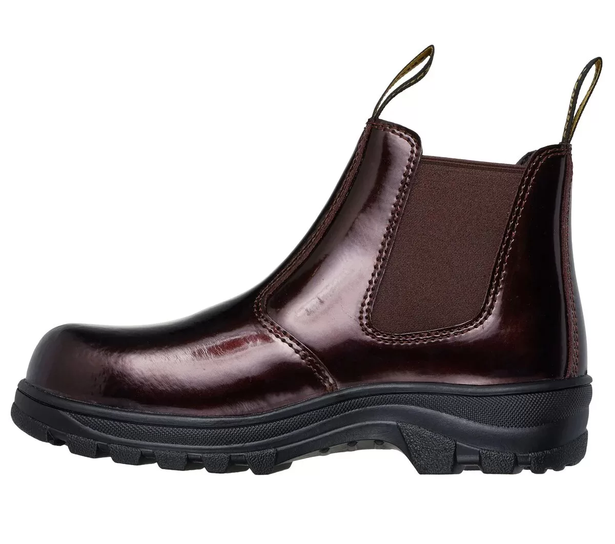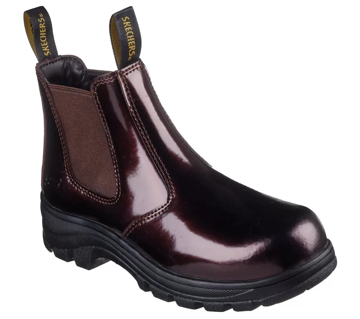 Work your shift in fashionable protection and comfort with Skechers Work™: Workshire – Sohlei. This pull-on Chelsea boot features a patent leather upper with twin gore panels, a non-metallic composite safety toe, slip-resistant outsole, and a cushioned Skechers Memory Foam™ insole.