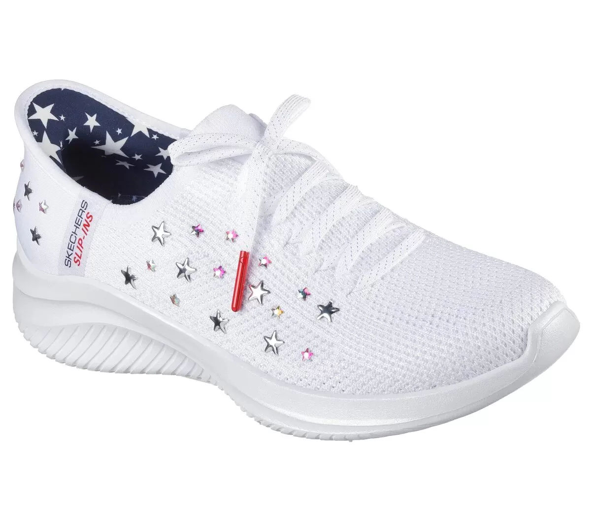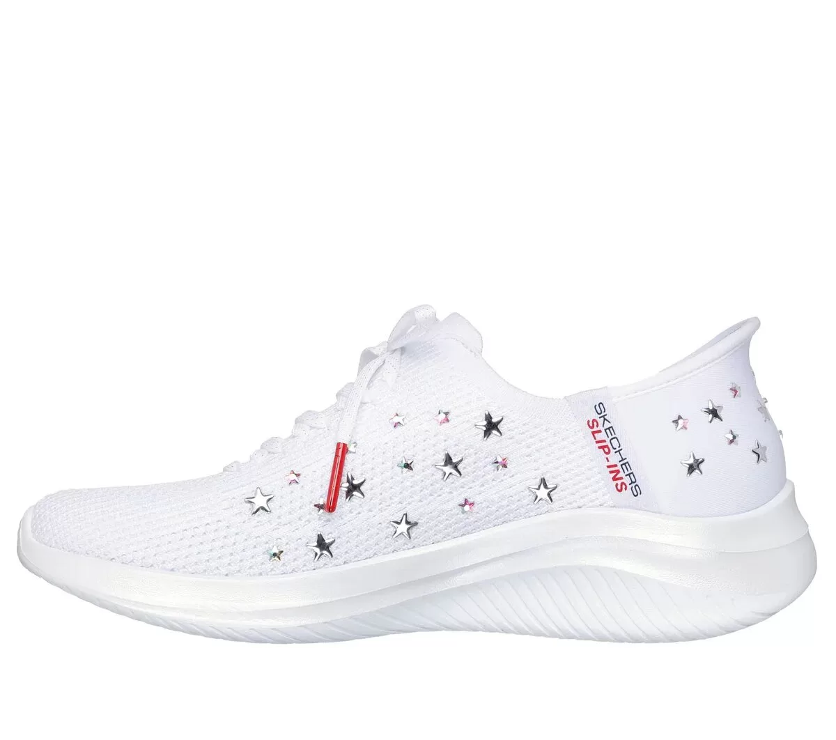 Step into easy-wearing comfort for the holiday weekend with Skechers Hands Free Slip-ins®: Ultra Flex 3.0 – Starry Dream. Designed with our exclusive Heel Pillow™, this vegan fixed-lace style features a Stretch Fit® engineered knit upper with metallic star studs and a cushioned Skechers Air-Cooled Memory Foam® comfort insole.