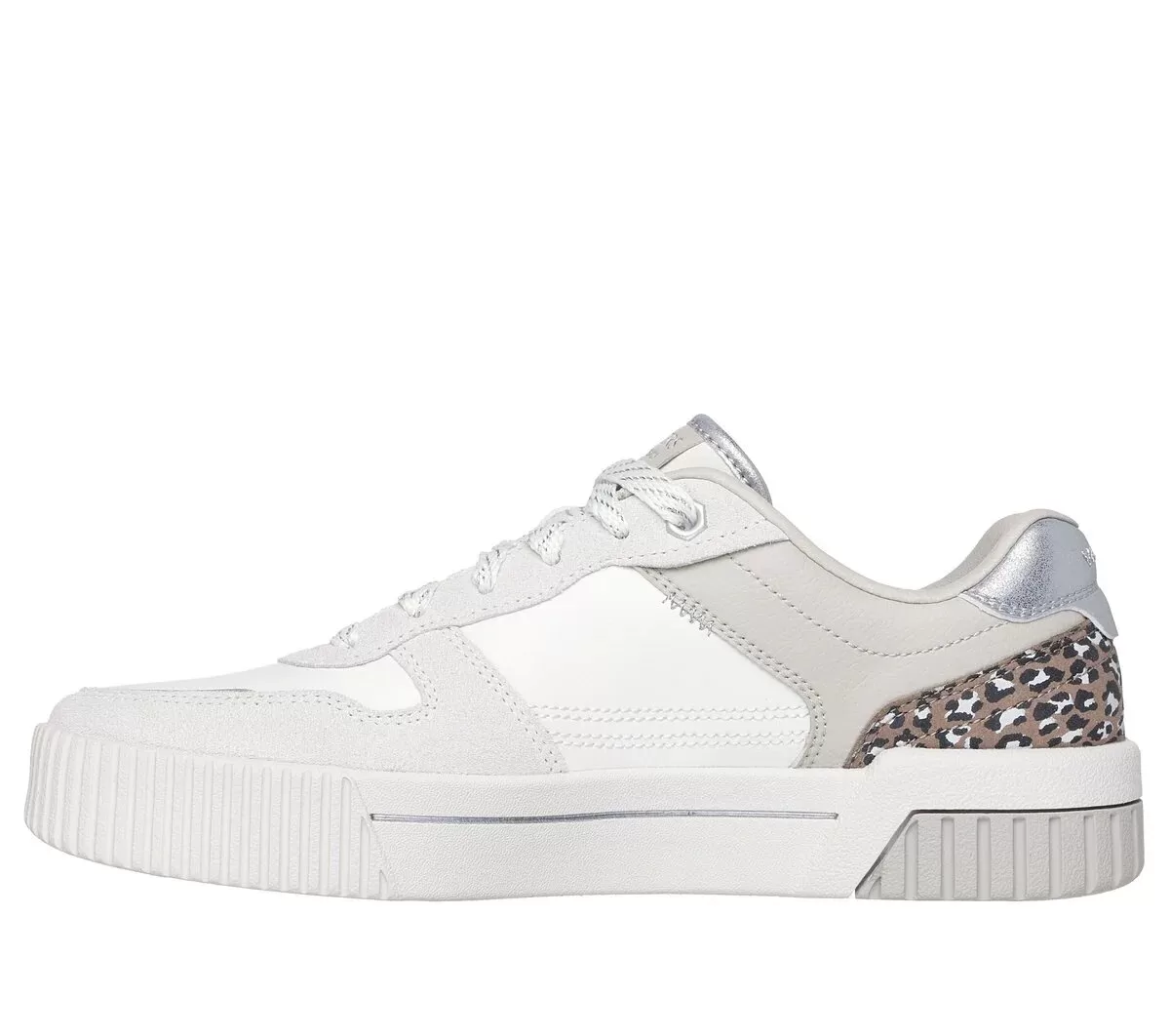 Enjoy purrrfectly styled court comfort wearing Skechers Jade – Lustrous Luxury. This low-top lace-up features a duraleather and suede overlay upper with a leopard print heel cup, metallic mustache detail, and a Skechers Air-Cooled Memory Foam[registered cushioned comfort insole.