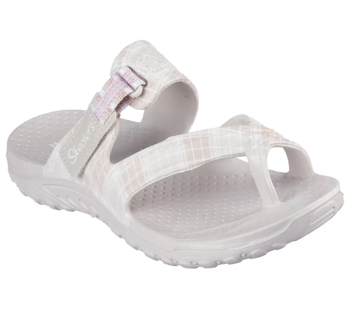 Enjoy breezy comfort in style with Skechers Foamies®: Reggae – Tartan. This vegan toe-thong sandal features a plaid printed Foamies® upper with an adjustable strap, and a cushioned comfort footbed.